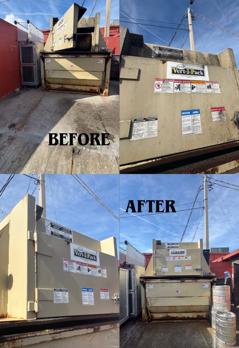 Deep clean and deodorize dumpster pads and enclosures to reduce odors, bacteria, pests, and unsightly buildup in common areas.